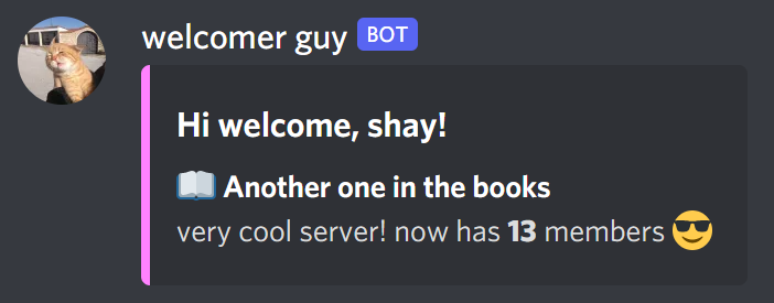 Discohook Utils allows you to set some placeholders for your hello and goodbye messages with /welcomer. Here's an example, and what it looks like can be seen below.